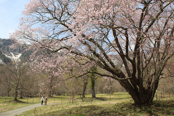 戸隠連峰をバックに咲き誇る、一本のオオヤマザクラの巨木「五地蔵桜」。残雪の戸隠連峰と淡いピンクのオオヤマザクラ。爽やかな戸隠高原の春の風景です。