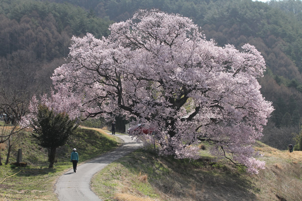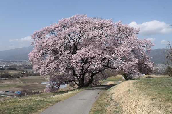 中央アルプスを望む伊那谷箕輪町の高台にある「長野県史跡・上の平城跡」の一本桜(エドヒガンザクラ)。高さ14.5メートル、淡いピンク色の花と樹勢の良さ、中央アルプスを望むロケーションなどから人気を集めています。