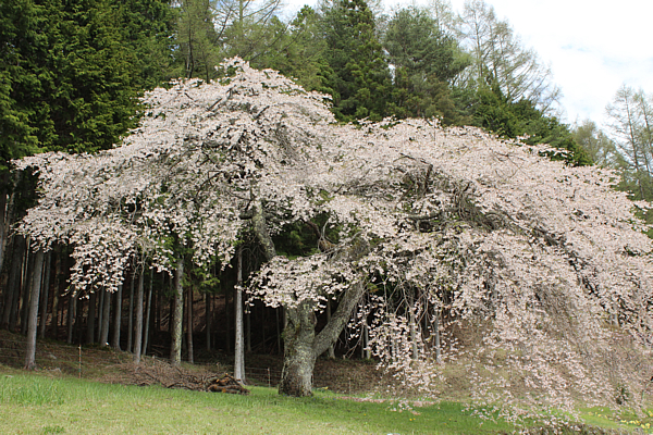 信州の最南端、山に囲まれた静かな里「売木村」。春の売木村は、山里に点在する枝垂れ桜がのどかな山村の風情を醸し出しています。桜の木は、名だたる巨木・古木こそ少ないものの、美しく整った枝ぶり、勢いあふれる花つきは他の地域に負けない魅力を持っています。この里の一本桜のほとんどはエドヒガンで、樹齢は数十年〜100年余り。明治の終わりから戦後にかけて、地元の人たちが植えたもの。根元には必ずといってよいほど馬頭観音などの石塔がたたずみ、かつて馬の飼育が盛んだった村の歴史を伝えています。