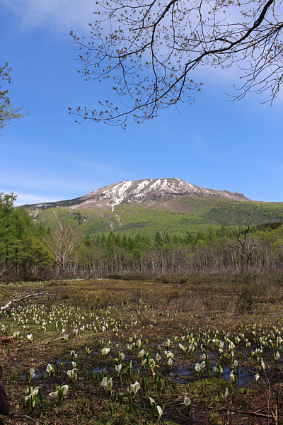 新緑の三田原山とミズバショウ(笹ヶ峰夢見平) (新潟県妙高市杉野沢笹ヶ峰 5月中旬〜6月上旬) 標高1,300m、手つかずの自然が残る妙高笹ヶ峰夢見平。残雪と新緑の妙高三田原山とミズバショウ。 一幅の絵のような爽やかな風景が広がっています。