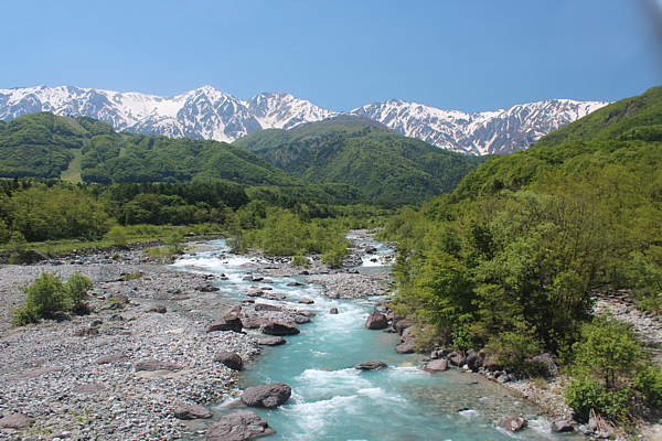 残雪の北アルプスと新緑の松川 (長野県北安曇郡白馬村 5月) 北アルプス山麓白馬村の松川橋より望む、残雪の白馬連峰と新緑の松川の清流。 一幅の絵画のような爽やかな風景。カメラマンに人気の絶景スポットです。