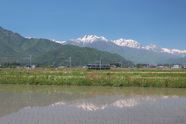 残雪の北アルプスとローカル列車 (長野県大町市常盤 5月) 残雪の北アルプス鹿島槍ヶ岳(右)と爺ヶ岳(左)をバックに、 新緑の田園地帯をコトコトと走る大糸線のローカル列車。 日本の原風景を想わせる、ほのぼのとした安曇野の風景です。